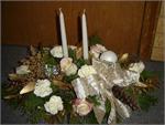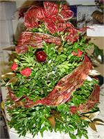 Fresh centerpiece with pillar candle with glass ornament with bow.