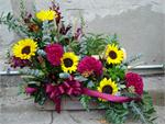 A nice fall mixture of bright autumn flowers. Script included with ribbon. Please indicate on special instructions preferred script.