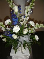 This lovely centerpiece has blue hydrangeas and white roses, white stock and greens.
