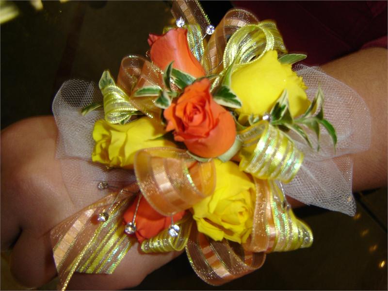 Wrist Corsage with Orange and Yellow Sweetheart Roses.